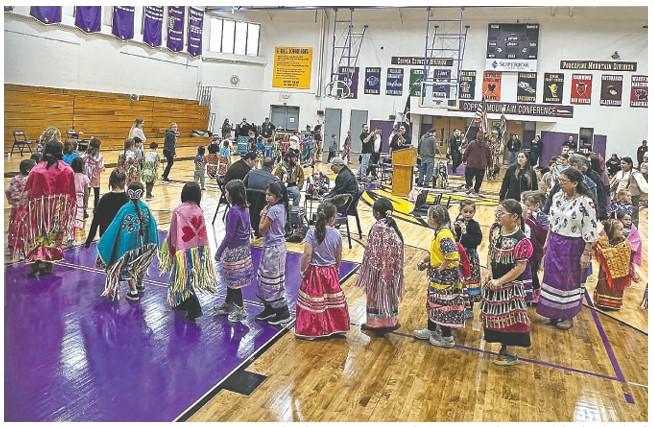 TEACHING CULTURE–Baraga Area School’s gymnasium was packed with colorful regalia and rhythmic dancing on Monday, Nov. 17, 2025, during KBIC Promise Neighborhoods’ sponsored powwow. The program began with the invited drum groups and head dancers making a grand entrance, their regalia sparkling under the gymnasium lights.